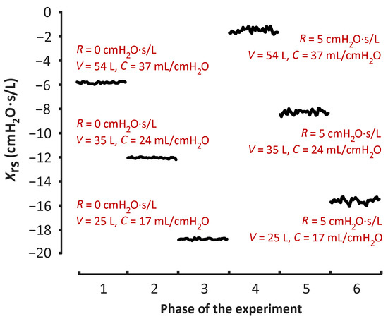The course of Xrs is shown in Figure 2 during the measurement of the modeled respiratory system without (R = 0 cmH2O∙s/L) and with an added resistor (R = 5 cmH2O∙s/L), with three sizes of the glass container (54 L, 35 L, and 25 L). The relative compliance Xrs determined from the pressure paw and flow qaw in the respiratory circuit decreased with the value of the volume of the used rigid container, and therefore with decreasing compliance. When measuring with an additional resistor, we detected higher values of Xrs compared to the corresponding measurements without the resistor.