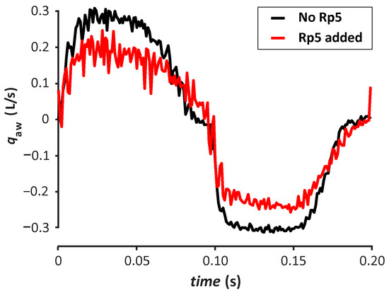 The values of the standard deviation of Xrs were very low (Table 1), which indicates a good robustness of the algorithm for Xrs calculation. The oscillation of Xrs around the average value was caused by the noise in the measured pressure and flow signals. Table 1 shows that the addition of the resistor into the ventilated system led to an increase in the value of the standard deviation of Xrs. This was caused by an increased noise amplitude in the flow signal after the addition of the resistor, as shown in Figure 3, in which the flow signals without and with the added resistor during one breathing cycle are compared.