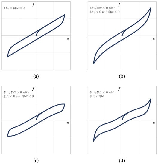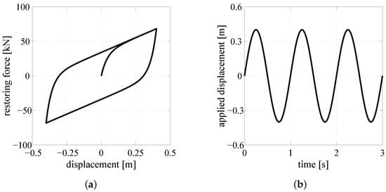 The typical restoring force-displacement hysteresis loop characterizing such a model may be limited by two parallel straight lines (curves), as shown in Figure 5a,b of Ref. [22]. In particular, the restoring force, during the generic loading case (), is evaluated as: