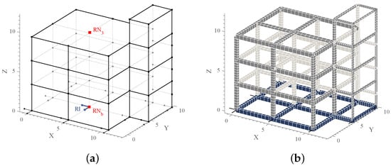 Figure 5a presents the three-dimensional (3D) structural model of the analyzed seismically base-isolated structure whose geometry is defined in a global, right-handed Cartesian coordinate system (O, X, Y, Z). In addition, Figure 5b shows the related extruded view to better illustrate the properties of beams and columns.