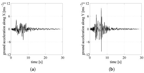 The NLTHAs are carried out by imposing, along the X-axis (Y-axis), the component SN (SP) of the 1994 Northridge motion, illustrated in Figure 6a,b, and by adopting a ground acceleration record time step of s.