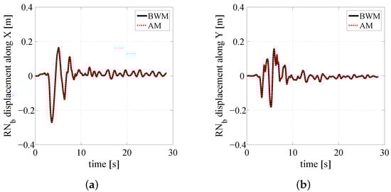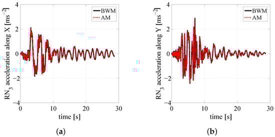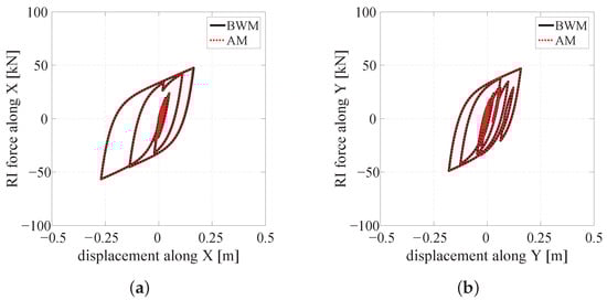 Figure 8a,b and Figure 9a,b show, respectively, the time histories of the displacement and total acceleration along the X (Y) direction, whereas Figure 10a,b illustrates the restoring force-displacement hysteresis loops, displayed along the X (Y) direction, by the reference isolator () highlight in blue in Figure 5a. Generally speaking, the comparison between the responses of the analyzed structure obtained with the AM and the BWM shows a very good agreement.