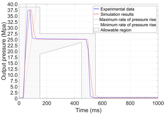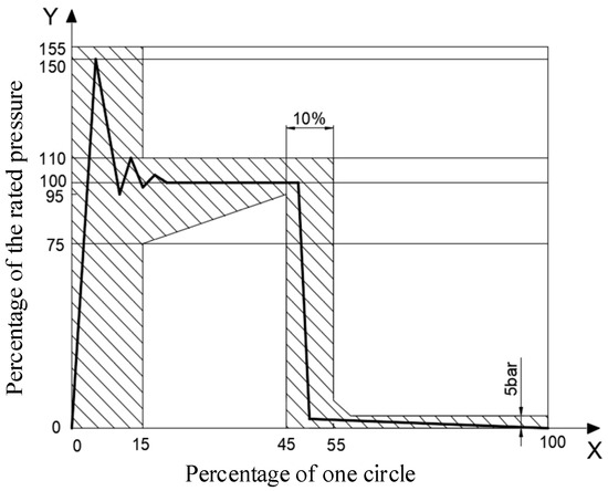 The American Society of Automotive Engineers (SAE) and ISO consider the water hammer wave or the hydraulic shock as one main pressure impulse wave standard for the impulse testing of hydraulic hoses, tubing, and fitting assemblies [7,8,9]. The standard pressure/time curves of the wave are shown in Figure 1. Since the produced trace of the dynamic pressure impulse should be mandatorily confined within the shaded area shown in Figure 1 [8], the development of the pressure impulse generator is increasingly important for achieving an acceptable hydraulic pressure impulse output.
