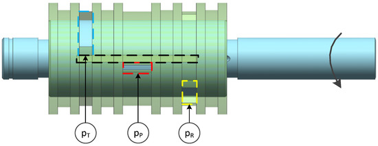 The main architecture of the new hydraulic impulse generator, as shown in Figure 2, can be divided into two parts. The left part, which is considered as the booster part, comprises a left block (3) with an asymmetric booster piston (4) and a connecter (2) that is connected to the tested hydraulic component (1). The booster piston partitions the interior into four chambers with different functions. The high-pressure chamber (A) forms the inner space of the tested components and is filled with the hydraulic oil for transmitting the pressure signals. The withdraw chamber (B) is connected to the rated pressure source () and contributes to increasing the declining slope of pressure signals. The air chamber (C) is connected to the air, and the low-pressure chamber (D) filled with hydraulic oil is directly connected to the output of the impulse generator part, a rotary spool (8), and electro motor (10). The impulse generator part has a right block (6) with a sleeve (7) inside. The rotary spool is supported by two deep groove ball bearings and a thrust bearing for the axial force balance. The electro motor is solidly set on a motor base (9) to drive the rotary spool rotating in the sleeve. The setup of the sleeve and rotary spool is shown in Figure 3. Three pairs of windows are symmetrically set on the sleeve, and from left to right, they are sequentially but independently connected to the back pressure (), peak pressure source (), and rated pressure source (). Since a couple of rectangular slots is also symmetrically located on the rotary spool and connected to the central drilling as shown in Figure 2, each window is scanned by the slot when the spool is rotated using the electro motor. Thus, the pressure signals from three different sources are obtained by the slot and outputted into the low-pressure chamber through the throttle valve (5) twice per revolution. Meanwhile, several small oblique holes on the right side of the drilling connect the two sides of the rotary spool to reduce the axial hydraulic unbalancing force. Thereafter, the pressure impulse signal is amplified by means of the booster piston and transferred to the high-pressure chamber to produce the required pressure waves for the tested hydraulic components.