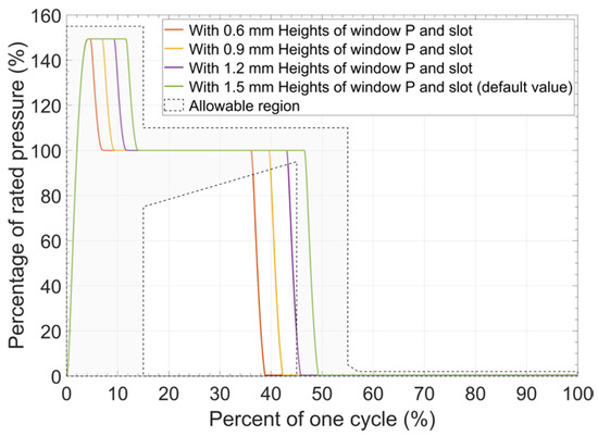 A notable difference between the default curve shown in Figure 5a and the standard curve shown in Figure 1 is in the form of the peak. The height of window P, , and the height of the slot, , are so large that the peak of the pressure curve is flattened. Figure 6 shows the results when both parameters are reduced simultaneously. Apparently, a smaller height corresponds to a sharper peak. However, reduction of either of the two parameters can cause a reduction of the wave’s duty cycle and the curve may exceed the tolerance range. This result implies that the height of window R, , should be increased.