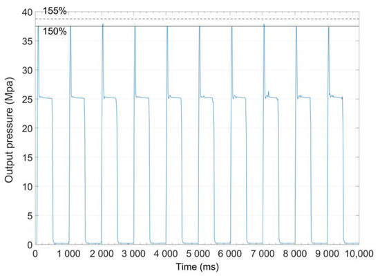 Figure 10 illustrates the simulation results and the experimental data for one period. It is obvious to notice the good consistency between calculations and experiments except the rate of pressure rise. The experimental results indicate a higher rate, which is most likely caused by the unpredictable volume of the high-pressure chamber as shown in Figure 8b. Besides, although the whole experimental curve is within the limited area, the pressure peak is flat at the 150% rated pressure for a short time (around 10 ms). The most likely reason for this phenomenon is the 100 Hz sampling frequency is insufficient to obtain the real peak point of pressure. The results for randomly selected 10 continuous periods are shown in Figure 11. In this figure, it can be seen that the peak pressure points of all 10 waves is below 155% of rated pressure (25 Mpa), but there are two of them larger than 150% of rated pressure (25 Mpa). This also certifies the analysis result for the above flat pressure peak. However, the results in Figure 11 prove that this impulse generator can provide well-repeated water hammer waves until any component of the test rig fails.