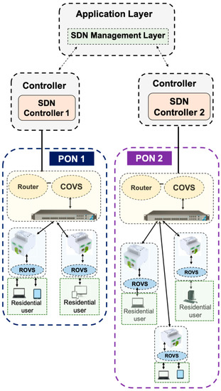 - Lee, Y.; Kim, Y. A Design of 10 Gigabit Capable Passive Optical Network (XG-PON1) Architecture Based on Software De-Fined Network (SDN); (ICOIN): Siem Reap, Cambodia, 2015. [Google Scholar]