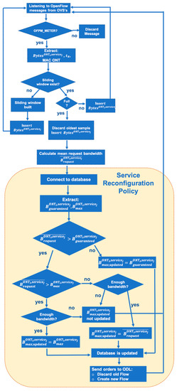 Therefore, in our OpenFlow approach, the bandwidth is not only controlled by the DBA algorithm in the OLT but is also managed by the SDN layer to provide a tighter control of this process. The SDN layer limits the maximum bandwidth for each residential user (and services) and the global available bandwidth at both channels of the GPON (upstream, downstream). In this way, the DBA is configured to treat residential users equally, but allocating bandwidth considering real-time traffic demands, as the differentiation and the fulfilment of bandwidth guarantees is provided by the emulated SDN layer implemented on GPON devices (OVS). Therefore, the OVSs (ROVS, COVS) drops those packets exceeding the maximum assigned bandwidth at each channel. In this way, the maximum associated with each service can be dynamically modified according to specific bandwidth allocation policies implemented by ISPs/Network Operators, allowing a real-time bandwidth reconfiguration according to the real-time requested bandwidth of residential users. Consequently, we propose an online service reconfiguration policy, in which users contract a guaranteed bandwidth and it can be offered an extra maximum according to the priority and conditions of the contracted Service Level Agreement (SLA) up to a maximum limit . Therefore, users do not need to request more bandwidth whenever they need it, but it is the external SDN management layer that monitors changes and decides to increase or decrease the bandwidth of residential users at a given time. Under this network scenario, the external SDN management layer by means of the ODL controller transparently gives a user some bandwidth in excess if it demands it and there is enough capacity in the GPON. Then, a bandwidth management program (located in the SDN management layer) is constantly listening for the arrival of OpenFlow messages (OFM_METER) and collecting the value of the demanded bandwidth of the sliding window that corresponds to one service of one specific ONT, calculating the average of the said window in real-time, as it can be observed in the flowchart of Figure 4. Every time the sliding window updates the mean requested bandwidth an instance is launched to the service reconfiguration policy to detect if the average bandwidth of the window is higher than the current maximum bandwidth, called in our algorithm. To do this, the algorithm first connects to the internal database that stores the maximum bandwidth and the guaranteed bandwidth of the contracted service. In the next step, the management program must assure the user an assigned rate always greater or equal than the basic contracted bandwidth in case the residential user demands it. Then, the program must verify that the requested bandwidth does not exceed the maximum contracted bandwidth . If all the conditions are met, the bandwidth management algorithm makes sure that the available resources are enough for the requested new bandwidth. In that case, the algorithm modifies this value , updates the database, and sends a request to the ODL controller to add new flows to the corresponding ONT (COVS, ROVS) with the new QoS requirements and discard the existing flows with the old QoS requirements. Otherwise, the maximum bandwidth is not updated and no commands are sent to the ODL controller.