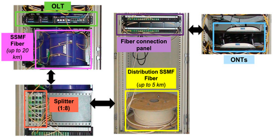 The commercial GPON (Figure 4) used to demonstrate the viability of our approach consists of an OLT (SmartOLT 350 of Telnet-RI vendor [30]), that supports 2.5 Gbps at the downstream channel and 1.25 Gbps at the upstream channel. The GPON testbed shows a tree topology configuration with a single splitting level. In this way, the OLT is connected to the optical splitter by means of three spools of Standard Single Mode Fiber (SMF) of different lengths (total length of 20 km). Then, the splitter (1:8) is connected to every ONT using SMF distribution fibers and the distance to each ONT is configurable, from 100 m up to 5 km, using a connection panel, as it can be noticed in Figure 5. This configurable network scenario allows setting up realistic situations where ONTs are located at different distances from the Central Office (OLTs). Finally, the GPON is equipped with L3 (with router functionalities) and L2 (without router functionalities) ONTs that comply with the ITU-T G.984.x/G.988 recommendations. The ONT models are the Wave Access 3021 (L3) and the Wave Access 512 (L2) [30]. Finally, in our particular approach, we attach computers (mini computers) to build routers with flexible capabilities by means of OVSs. For our experimental study, we connect five ONTs, two L2 ONTs, and three L3 ONTs.