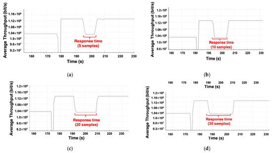 Test done on the size of the sliding window: (a) Five samples; (b) 10 samples; (c) 20 samples; (d) 30 samples.