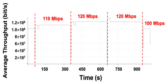 Then, Figure 9 shows the real-time evolution of the allocated bandwidth for the service of the ONT measured using Wireshark when the algorithm is working. Therefore, in the first Interval (0–60 s) the service is not modified, since the transmitted rate is equal to the basic contracted bandwidth (100 Mbps). In addition, it can be observed that at the beginning of each interval, a short step appears due to the reaction time of the OVS to a change in the user’s transmission rate, as the OVS needs a few seconds (around 5–7 s) to notice an increase. If we analyze each interval one by one, in the second (60–360 s), where the residential user demands 110 Mbps, we observe the first step, followed by the time the algorithm needs to process the real-time demanded bandwidth of the sliding window, and then the instant where the algorithm provides the offered bandwidth to 110 Mbps (its bandwidth demand). The third Interval (360–660 s), where the user demands a rate of 120 Mbps, the result is similar and 120 Mbps are given (the maximum excess bandwidth). However, in the fourth interval (660–960 s) the residential user increases its demand up to 130 Mbps, but the algorithm limits this demand, since the maximum bandwidth associated with this Internet plan is 120 Mbps. Finally, in the last interval (960–1020 s), the user decreases its demand to 100 Mbps, so the algorithm assigns this bandwidth instantaneously. Consequently, it can be noticed that the algorithm implemented in the SDN layer shows a fast and stable response according to the contracted Internet plans of residential users. Moreover, it should be noted that DBA algorithms may need extra time to react to changes in the transmission rate of users as well as the OVS.