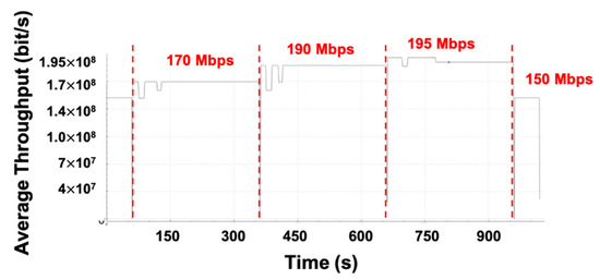 Unlike the previous case, now the residential user has a basic bandwidth higher than 100 Mbps, in which the corresponding Internet Plan may provide an excess bandwidth of 30%, so the maximum bandwidth that could be assigned is 195 Mbps, as observed in Table 3 in the interval 660–960 s. Therefore, the algorithm will create new flows based on the average bandwidth of the window, until reaching the maximum established of 195 Mbps. Figure 10 represents the real-time evolution of the allocated bandwidth for the service of the ONT measured using Wireshark. During the first period of change 60–360 s, in which the requested transmission rate is 170 Mbps, the algorithm shows two small steps and two transition zones between them just after offering this requested bandwidth. As it was mentioned before, the first step corresponds with the time required by the OVS to detect the change in the transmission rate of the user. Meanwhile, the algorithms process the data of the sliding window and send the order to the ODL controller to change the maximum bandwidth. Then, the second step corresponds with the time that the OVS needs to receive, process, and update the new flow sent by the ODL with the new transmission rate (meter) so the OVS becomes unstable during this period of time. Finally, the OVS updates the new maximum permitted bandwidth to 170 Mbps, that is the real- time demanded bandwidth. For the second period of change and the third, the performance of the algorithm is similar. Therefore, it can be noticed that the algorithm is able to dynamically evolve the allocated bandwidth according to the stipulated QoS requirements although the OVS needs a certain time to react to real-time changes in the transmission rate of users. In the same way, typical DBA algorithms inside OLTs probably also take time to deal with real-time changes in the transmitted traffic of residential users.