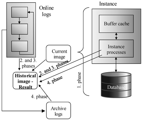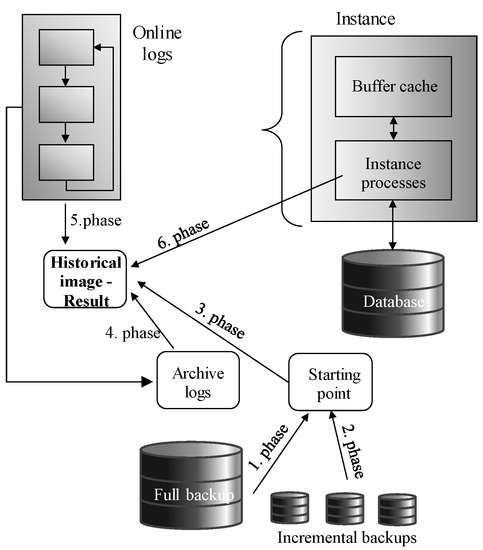 The reason for discussing log files is mostly associated with the usage in terms of temporality. The first solutions dealing with historical data were based on using log files to obtain historical data image. In principle, log files can be used to get the data image in the defined time point or even interval in the past. The prerequisite is just the completeness of the log files, otherwise, the reached object could be invalid, not covering the missing changes. If the log file list is complete, historical data can be obtained. Figure 2 shows the steps to get a historical image. The evaluation consists of four phases. In the first phase, the current data image is obtained. Then, online logs are applied to get the required time position (the second and third phase). They are operated by the instance background processes (Log Writer, Process Monitor, etc.). The process is physically modeled by two phases (second and third phase), whereas the log data are partially in the instance memory (for not approved transactions and in online log repository located in the physical the storage (for active and inactive transactions). Finally, an optional step is presented (the fourth phase), if the online logs do not cover the defined time point. In that case, archived log files are used, extracted, and applied to the objects. After processing, a historical data image can be obtained. The limitation is just the necessity to scan all log files sequentially, whereas individual states influence the consecutive state, it cannot be applied in parallel, directly. In [9,10], transaction operation precedency is discussed, by which just the most historical object is created, without the change monitoring. As the result, the historical image can be built sooner, and parallel data processing can be used, which dynamically improves performance. If the archive log mode is not enabled, historical data can be created in only a limited time manner [10]. Similarly, if any log file is not present, historical data cannot be obtained, at all. From the log header, it is not possible to detect, whether the particular transaction operates with the relevant object or not. Thus, all log files must be scanned in a time-ordered manner, even if they do not cover any change on the required object [8,10]. Even more, the particular object does not need to be part of the current data set, it could be removed sooner by the Delete operation [11]. In [12], another solution dealing with historical images was defined. The starting position does not need to be a current data image, any historical backup can be used, as well. The profit can be reached by reducing the amount of the logs to be applied promptly (logs are always sorted on time by the SCN value—System Change Number, which evolve sequentially). Figure 3 shows the processing data flow. In the first step, the nearest data image is obtained, provided either by the current image or the backup. If the backup is used, the whole data image has to be referenced (whole/complete/level 0 backup). In the third step, incremental backups can be applied, the preferred type is cumulative, however, incremental can be used, as well, but in that case, the individual object can be referenced multiple times by applying all changes over the time, which limits the performance strategy [13]. At last, individual logs are used—first archived and then online. Reflecting on the performance, there is an assumption, that the number of logs can be lowered by using backups. In [14], performance limitation is discussed, just with an emphasis on backup loading, which can be resource-demanding, as well. There are several enhancements of the log file management to cover historical images. Flashback technology can automate the process [10]. Extension to the Flashback data archive provides a robust solution by defining attribute sets, which have to be monitored over time. Thanks to that, the amount of the data to be parsed and evaluated is lowered. Principles are defined in [6]. Performance improvement of the Flashback data archive can produce object specification distribution, where the individual objects are divided into sets covering the range of attributes. From the performance point of view, it can bring noticeable performance improvements [15], however, a strong problem can arise there if the references across the distributive architecture have to be used, to ensure data consistency. In that case, several segments have to be notified to cover reliability and integrity. Note please, that the references can be created, reflecting the foreign keys. If any object created as the composition of other objects is changed, also the secondary objects need to be monitored, etc. [15,16].