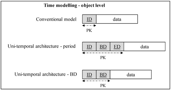 The architecture and principle of the system are shown in Figure 4. The first model represents a conventional—non-temporal model. Only current valid states are stored in it. If a change occurs, the individual versions are not reflected. The direct Update command is executed by which the original records are physically overwritten by the new ones. An overview of individual changes is thus lost. Individual data fixes and version control cannot be processed, at all. In terms of time, it is always just the current time image. The second model in Figure 4 is uni-temporal. The primary key is extended by a time interval modeled using the attributes BD (begin point of the validity) and ED (end of validity). Since the state identifier (primary key) is composite—it consists of the object identifier—ID (naturally, the object identifier itself can be composite) and the time limits—BD, ED, it is possible to record individual states positionally in time. The expiration date is often undefined from a logical perspective, but it is not physically possible to use a NULL value precisely because this attribute is part of the primary key and must hold real value. In principle, three solutions are used, either replacing an undefined value with another expression, usually a sufficiently large time representation (e.g., 31-12-9999 as the currently maximum modelable time point in the DBS) [10,14] or removing the expiration attribute from the identifier definition. In principle, this is technically possible, because the {ID, BD} pair itself must have a uniqueness property, as the time intervals for a particular object must not overlap. On the other hand, the time frame thus defined is not correct from a logical perspective. This is based on the original concept of the period data type. At present, the validity interval expressing the beginning and the end of validity is often modeled by two-time points, i.e., two attributes, but both are inseparable and interdependent. In the defined architecture, after removing the time attribute BD or ED, the temporality would lose its meaning. It would not be possible to define time positionally, nor to resolve collisions and undefined states [20]. The third solution was introduced in [3] and it is based on replacing undefined values with the specific pointers to the instance memory reflecting the data types. Thanks to that, particular values can be part of the index, and data retrieval efficiency can be ensured. In comparison with the default values replacing the undefinition, respectively in an unlimited time manner, there is no problem with the consecutive interpretation of the values. Moreover, such a concept can be used generally for any data type, which just limits the problem of designing a suitable value to replace an undefined value, both physically in the database and interpretation and indexing. Besides, it should be emphasized that using a different value to specify an undefined value requires additional disc requirements because these values must be physically stored in the database. The simplification of the second model in Figure 4 is a representation of a third object-oriented time model. Its representation is also shown in Figure 4 (last model). The time representation is expressed only by the beginning of the validity, and therefore each additional state automatically limits the validity of the direct predecessor. The primary key is again composite but consists of only two elements—the object identifier (ID) and the beginning of validity (BD). The advantage of the mentioned third model is the reduction of disk space requirements. On the other hand, in such a system, it is not possible to directly model and identify undefined states, these must therefore be defined explicitly [16,21]. Principles of undefined state management and identification are covered in [24,25] It must be stated either explicitly [16] or by pointing the state to the undefined memory locator [25] improving performance, whereas the whole state is grouped, whereas the object level granularity is used.