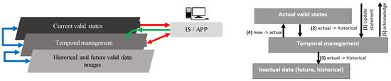 The attribute-oriented temporal approach is based on the mainstream system used within the temporal paradigm—object granularity, in which any change causes the creation of a new state, which may lead to the need to store duplicate values if some attributes do not change their values over time with each Update operation. This causes increased costs for disk space, processing, storage, and evaluation. In such a system, there are no direct links between the Update command and the attribute change. It requires the sequential comparison of individual values forming states, or versions of objects [26]. The aspect of value change also plays an important role here, with an emphasis on identifying a significant change. The minimum change in value may not be important for the system and may not need to be recorded in more detail [10,16,27]. In this case, it can be declared that the existing value expresses another state without change. The significant increase in the amount of data to be processed and its heterogeneity brought the need to create a new temporal architecture that could cover current trends, object volatility, sensory networks, and overall monitoring of object states throughout the time spectrum. The essence of the implemented solution is to move the granularity of processing to the level of the attribute. Thanks to this, individual changes are always associated with a specific attribute, the overall view of the object in a defined time is created by the composition of individual partial values of attributes. Principles are defined in [28]. Technology improvements of the temporal layer are defined [28] by correlating the same data type to the common group. The architecture consists of three layers. The first layer is conventional covering Current valid state images. Historical data and future valid images are in the third layer. Finally, the core element is supervised by the second layer (Temporal management). Any change is monitored and maintained by the temporal module. Each change of the attribute fires adding one extra row into the temporal table (located in the Temporal management layer). Architecture is in Figure 5. The left part of the figure shows the architecture and interconnection to the application. Blue arrows represent the data communication between individual layers. Whereas the whole communication is supervised by the Temporal management, future valid states cannot be routed to the current layer directly. Similarly, current states cannot be operated and marked as historical without the approval and acknowledgment of the temporal management layer. External applications can be mapped either into the temporal management (green arrow in the left part of the figure) or to the current valid states, as well (red arrows in the left parf of the figure). The reason to propose both techniques is based on the existing applications dealing with only current valid states. The aim is to offer the possibility to remain the original application without any change, only the flag to the temporal layer as the supervisor is done. Note, that the data provided is secured, thus the application cannot directly locate individual layers.