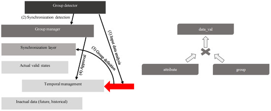 The limitation of the attribute level temporal system defined in the previous paragraph is correlated with the effectiveness of the Update statement. If multiple attributes are updated at the same time, each of them requests inserting a new row into the temporal layer, which creates performance limitation and the bottleneck of the whole system. Group level temporal architecture is based on synchronization groups detection. The managed granularity of the temporal layer can be either the attribute itself or the whole synchronized group, which is detected and managed automatically. Figure 6 shows the architecture. Black arrows show the data flow during the synchronization group detection. Input data are analyzed in the first phase. If any relevant synchronization is detected, the Group manager is contacted (2). In the third phase, the new group is created and its temporal definition is stored in the temporal management (4). The red arrow represents the input data stream to the system. In comparison with the attribute oriented solution, external systems cannot access actual valid states directly, whereas the group detection would be avoided.