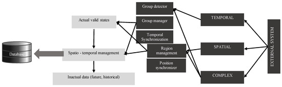 Architecture is in Figure 7 extending the temporal concept by the spatial reference. In comparison with the core group level system, the interface is extended covering the spatial positions and categorization. Note, that the region definition can evolve and the temporal layer must reflect the structure changes.