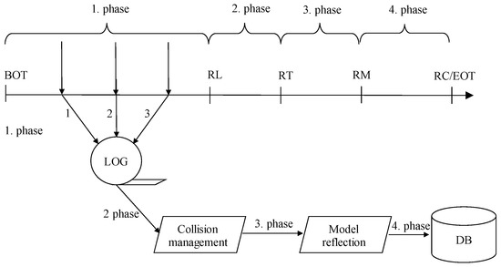 In this paper, we propose an extended solution for the TLAR covering the particular data model, as well. Thus, in the first phase, data are logged regardless of the constraints. Thanks to which all changes are preserved, regardless of their correctness and applicability. Secondly, state overlapping is detected, covered by the TLAR, as well. As stated, any object can be defined by just one state anytime. The third phase evaluates the data model. The data model can evolve by extending, adding, or dropping existing constraints. Data attributes and integrity can be enhanced, as well. Thus, each database element is determined by the activity time frame, to which it belongs. Data model image is then composed as applying all data model segments, which are valid in the defined time positions. In conventional systems, the Two-Phase Commit protocol ensuring transaction durability and whole process reliability is used [10,11]. It is based on the logging, by which any data portion should be placed in the logs before the change itself. For the temporal environment, log management was extended by collision detection and management forming the Three-Phase Commit protocol. In this paper, we propose Four-Phase Commit protocol (4PCP) to manage the data model covering, as well. Figure 8 shows the data flow. The first step is associated with the transaction logging in the autonomous transaction, thus even after the main transaction refuse, objects are present in the temporal layer, however, just with the User rollback flag. Afterward, consistency reflecting the data model is measured. If the new state temporality reflects state immediately valid, respectively data correction to the historical data images, “AS-IS”, respectively “AS-WAS” model can be used, reflecting the data model valid in the defined time point or interval. Transaction control can evaluate, whether the states fulfill all the requirements and all constraints are passed, even if multiple data models are valid during the time interval. Dealing with future valid data is, however, far more complicated. First of all, the “AS-IS” approach cannot be used, whereas it must reflect conditions in the objective time frame denoted by the validity. In ideal conditions, the particular data model is available, thus the transaction can evaluate and reflect either data model, as well as all constraints. Thus, the “AS WILL BE” delimitation can be done. Vice versa, if the data model is not defined for that moment or time frame, evaluation cannot be done, transaction control cannot manage constraints, at all. In that case, the transaction has ended successfully and constraint management is shifted to the time, the data model is present and properly defined. By specifying a new data model or changing environment, the original transaction can be reopened to notify the data model. As the result, the originally conditionally approved transaction is reevaluated. Naturally, dependent objects can be identified in other transactions, thus the constraint checking does not need to cover only one transaction, however, the transaction chain can be necessary to be reevaluated. The temporal layer comes to the solution of the problem, which covers all the changes, even refused or corrected. By referencing time and transaction pointers, it is always possible to ensure data correctness and consistency, if any metadata characterizing conditions or environment is changed. Figure 8 shows the evaluation data flow in the UML diagram. The first phase is delimited by the logging until reaching the Ready to Log (RL) data point. The second phase deals with collision management. State overlapping is managed regarding the defined rules. The transaction timeline is bordered by the Ready to Transaction Collision (RT) point. Data model reflection checking is done in the third phase, ensuring that all constraints will be passed in the future valid model, if available. It is delimited by the Ready to Model (RM) point. Finally, in the fourth phase, data are shifted into the database, and the transaction is approved reaching Ready to Commit (RC) and the transaction is ended (EOT). Begin point of the transaction is denoted by the BOT.