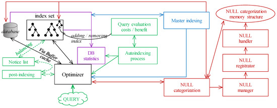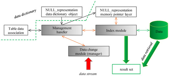 In the relational database systems, various types of indexes can be present, like B+tree, bitmap, function-based, reserved, hash, etc. [1,34]. The specific category covers string indexing and full-text options. Temporal and spatial indexes have the common index types, however, almost all of them are based on the B+tree indexing, which is also the default option, as well. B+tree index structure is a balanced tree consisting of the root and internal nodes sorting data in a balanced manner. In the leaf layer, there are values of indexed data themselves, as well as ROWID pointers. Individual nodes are interconnected, thus the data are sorted in the leaf layer across the index set. To locate the data, index traversing is done using the indexed set resulting in either obtaining all data portions needed or by obtaining ROWID values, by which the other data attributes can be loaded easily (executing Table Access by Index ROWID (TaIR) method. Reflecting the data integrity, it is always ensured, that any data change is present in the index after the transaction approval. There is, however, one extra limitation associated with the undefined values. They are commonly modeled by using NULL notation, which does not require additional disc storage capacity. Whereas NULL values cannot be mathematically compared and sorted, NULL values are not indexed, at all [24,35,36]. Although the database statistics cover the amount of the undefined values for the attribute, they do not reflect the current situation, just the situation during the statistics were obtained, thus they cover mostly background for the decision making in terms of the estimation. Management of the undefined values inside the index is currently solved by the three streams. The first solution is based on the default values, which replace the values, which are not specified [4,26]. The problem causes just the situation when the NULL value is specified explicitly. In that case, the default value cannot be used. The complex solution can be provided by the triggers [6], replacing undefined values. From the performance point of view, there are two limitations, first of all, it is associated with the trigger firing necessary, which must occur for each operation. In the temporal environment, where a huge data stream is present, it can cause significant delays and reliability issues. Second, default values are physically stored in the database, thus it has additional storage capacity demands. Finally, undefined values can origin from various circumstances, thus undefined values can be represented by the numerous default values expressing e.g., undefined value, delayed value, inconsistent value, non-reliable value, the value of the data type range, etc.