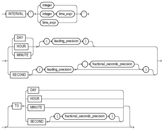 - Oracle Documentation–INTERVAL Data Type. Available online: https://docs.oracle.com/en/database/oracle/oracle-database/19/sqlrf/Data-Types.html#GUID-E405BBC7-DA9A-4DF2-9F22-E60CB9EC0705 (accessed on 1 December 2020).
