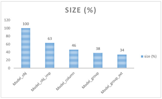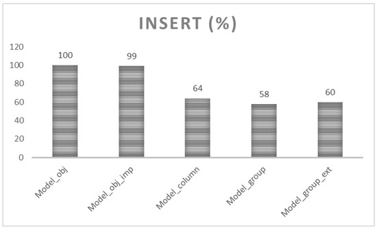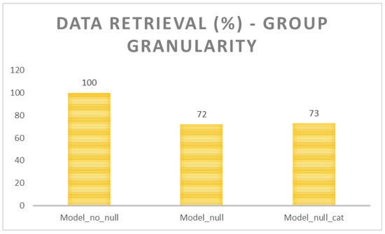 Undefined value management forms a crucial aspect limiting the performance and evaluation process. As stated, NULL values are not part of the B+index structure. Furthermore, it does not have a specific meaning. We cannot state in the temporal sphere, whether such event will be in the future or not, even whether such events have not occurred yet, particular states cannot be sorted, mathematically treated, and evaluated by the origin of a given undefined value. Therefore, this experiment covers the performance definition protected by undefined value management. The core architecture uses the group granularity evaluated in experiment 1 (Model_group). The environment solution deals with the three models. The reference model (Model_no_null) is delimited by the pure spatio-temporal architecture, which cannot cover undefined values in the index structure, at all. Model_null covers only undefined values in one category with no origin reflection. It does not have any storage demands, whereas such NULL values are not treated physically. By adding an external module associated with the index root node, NULL values can be placed in the structure and located by the index itself. The demands, in comparison with Model_no_null, are lowered to the value 72%, as the result of the undefined value accessibility by the index by replacing Table Access scanning necessity by the index approach managing data range. Thus, it uses the Index Range Scan method or Unique Scan, respectively, if the condition is based on a unique value set. Model_null_cat reflects the memory structure NULL_representation as the pointer layer delimiting the meaning and origin of the undefined values. In this case, 3 categories for treating NULLs are used, however, based on the evaluation, it can be stated, that the number of categories has minimal impact on the performance. The difference is just the pointer destination, however, the size and principle reflection remains still the same. When dealing with the NULL categorization, reached performance results are 73% in comparison with Model_no_null. Comparing index structures dealing with undefined values inside the system (Model_null and Model_null_cat), there is only a slight performance difference, which is, however, fulfilled by obtaining more complex information regarding the undefined value origin and reliability of the data. If the Model_null is referential (treated as 100%), then the Model_null_cat requires additional power ranging 1.38%. Figure 23 shows the results reflecting group granularity with various NULL management definition principles.