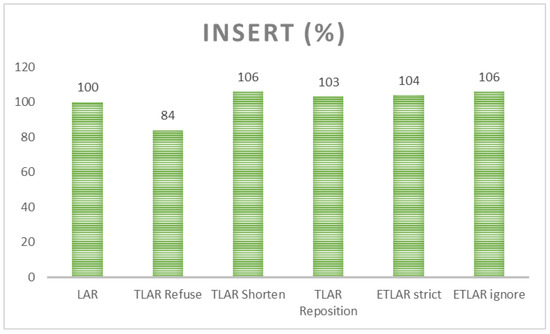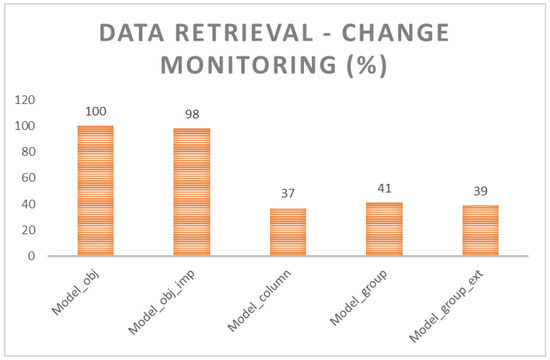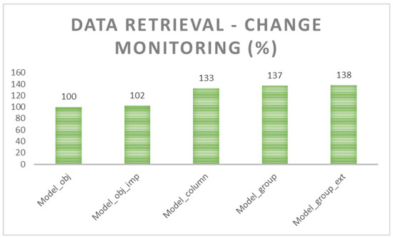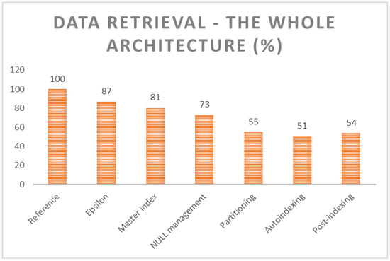 The reference model does not use any already defined modules (reference 100%). Reflecting the sensor-based data about the drivers defined in [28] reflecting principles covered in [40,41,42], Epsilon definition lowers the processing time demands to 87%. Evaluation is done in the preprocessing layer of the database system, individual background processes are contacted only if it reflects the relevant change. Master index extension requires only 81%. Its benefit is based on the fragmentation, which is present at 10%, of which 3% of the blocks are empty. Migrated row problem is not present, whereas there are not physical updates. NULL management module significantly improves the performance, first of all, the index can be always used, whereas pointers to the whole relevant data are there, secondly, the Master index portfolio set can be extended, as well, any index can be marked as Master. NULL module extension limits the demands to the value of 69% if there is no specific categorization of the NULL values. If the 3-type categorization is present, the demands are 73%. One way or another, there is always a 10% demand drop. Spatio-temporal partitioning, as stated, allows the process of data in parallel. Spatiality is covered by 8 regions. It requires 55%, which is mostly caused by parallel processing followed by the result set unification. Autoindexing module covers only 4% benefit in comparison with the already defined modules. Based on the analysis, there is no significant space for improvement. Master index and NULL management modules ensure, that the whole table scanning, block by block, is not executed at all. Vice versa, adding a new index dynamically benefits only if the query type set is relatively static, otherwise, the whole module is disabled, it cannot predict the future queries to handle indexes. The main advantage of the post-indexing is the extraction of the B+tree index balancing directly during the main processing. Thus, when dealing with data changes, the solution benefits. Vice versa, during the data retrieval process, it cannot be ensured, that all changes are already applied to the indexes, thus the evaluation must be two-phase—the index itself is evaluated and scanned to find relevant data directly or ROWID or BLOCKID, respectively. As stated, it does not need to cover all changed data, therefore the Notice list must be checked and relevant changes extracted. The total demands are 54% if the autoindexing is enabled. If it is disabled, it requires 57%. Figure 25 shows the results in the graphical form.