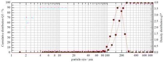 Particle size distribution (PSD) of BR44. The figure shows the cumulative and density distribution of one batch of BR44 as a representative example. X10 = 116 µm, X50 = 166 µm, X90 = 220 µm.