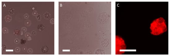 Fluorescent microphotographs of the MCs prototypes. (A) BR13 (negative control): poly(d,l-lactide-co-glycolide) (PLGA) MCs without gelatin after reaction with the CF633 dye, exposure time: 400 ms, no fluorescence in the red channel. Magnification 100×, scale bar 150 µm. (B) BR44 no staining with the CF633 dye (negative control), no fluorescence in the red channel. Magnification 100×, scale bar 150 µm. (C) BR44 reaction with the CF633 dye, exposure time: 400 ms. Magnification 200×, scale bar 150 µm.