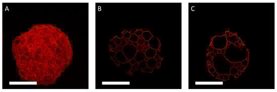 Confocal microscopy analysis of the prototype BR44 MC stained with the fluorescent CF633 dye. (A). 2D convolution. (B,C). Microphotographs of two different sections. Magnification 400×, scale bar 100 µm.