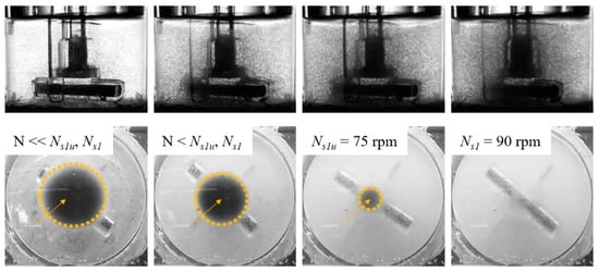 BR44 MC suspension dynamics. Photographic pictures (side and bottom view) of the MC distribution during the suspension studies. Ns1 was defined as the impeller speed required just entirely to suspend all MCs. Ns1u was defined as the lower limit of Ns1, meaning that some MCs were still located at the bottom of the flask, but none were at rest.