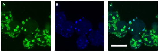 Nuclei staining is a reliable approach for assessing cell density during the MC-based culture of adherent cells. After two and four days of growth, MCs with attached cells were treated with a fixing solution (2% formaldehyde, 0.2% glutaraldehyde in PBS, Sigma-Aldrich Inc., St. Louis, MO, USA) for 30 min on ice, washed two times with PBS, and then resuspended in 500 nM DAPI (4′,6-diamidino-2-phenylindole) solution (Sigma-Aldrich Inc., St. Louis, MO, USA) for 20 min at room temperature in the dark. After two additional washing steps, the MC-cell aggregates were resuspended in 85% Glycerol solution and mounted for microscopic analysis on µ-Dish (Ibidi, Gräfelfing, Germany). Images were acquired using an inverted fluorescence microscope (UV laser 405 nm) Nikon Eclipse Ti (Nikon, Minato, Tokyo, Japan).