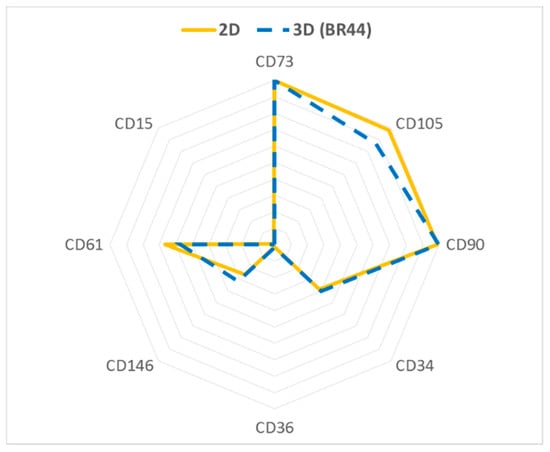 Reagents: Each test contained different mixtures of the following antibodies: CD73-FITC, CD105-PE (BioLegend, San Diego, CA, USA), CD34-PE, CD36-APC, CD90-FITC, CD146-PE (Miltenyi Biotec, Bergisch, Germany), CD61-PE (Beckman Coulter Inc., Pasadena, CA, USA), CD15-FITC, and 7-AAD (Becton Dickinson, Franklin Lakes, NJ, USA). All of the antibodies were titrated to optimize the signal–to–noise ratio and used at a 50 ng/test concentration. The same final concentrations of the isotype controls and the specific mAbs were used. Staining procedure: 50,000 cells (in 100 µL FACS buffer) were pipetted into a well, gently mixed with the appropriate antibody combination, and incubated in the dark for 15 min at room temperature. Finally, the sample was diluted with 100 µL FACS buffer before the cells were acquired. Instrument Setup and Sample Acquisition: Cells were acquired using a Cytoflex flow cytometer (Beckman Coulter Inc., Pasadena, CA, USA) and analyzed using Kaluza software (Beckman Coulter Inc., Pasadena, CA, USA). No statistical and significant tests were performed on marker expression. To determine the fluorochromes’ spill-over coefficients, fluorescence compensation was assessed using single stained control particles (VersaComp Antibody Capture Bead Kit, Beckman Coulter) or cells. The compensation matrix was determined using the Kaluza software’s dedicated function. 7-AAD was used to discriminate between dead and live cells. Flow-check fluorospheres (CytoFLEX Daily QC Fluorosphere, Beckman Coulter) were run periodically to verify optical alignment and fluidics. Detailed information on the antibodies can be found in Supplementary Material Table S2.