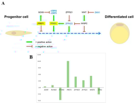According to the manufacturer’s instructions, RNAs were extracted from cell pellets or MCs covered with cells using the Nucleospin®RNA kit (Macherey-Nagel, Düren, Germany). The kit’s purification procedure also includes an on-column digestion step using DNase I. RNA purity and quantity were assessed with the NanoDrop device (Thermo Fisher Scientific, Waltham, USA) total RNA integrity was periodically verified by conventional agarose gel electrophoresis. cDNA was obtained from 400 ng RNA using the GoScriptTM Reverse Transcription System (Promega, Madison, WI, USA), and the protocol can be found in Supplementary Material, Table S3. RT-qPCR of the SOX9, RUNX2, PPARG, PREF1, ZFP423, ZFP521, WISP2, and DKK1 genes was performed using the SsoAdvancedTMUniversal SYBR®Green Supermix kit (Biorad, Hercules, CA, USA) and detected using the CFX Connect system (Biorad, Hercules, CA, USA). RT-qPCR was performed for each gene using 20 ng of cDNA, and ACTB was used as an internal control. Each primer pair product was checked for proper amplification by agarose gel electrophoresis. Only primers that gave rise to single sharp bands of the expected size were used. Primer sequences, temperature, and cycle conditions can be found in Supplementary Material Tables S4 and S5. The data were analyzed using the CFX software to calculate the relative fold gene expression using the formula 2−ΔΔCt. No statistical and significant tests were performed on gene expression.