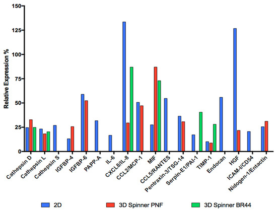ASC52telo cells were grown in standard cell culture vessels (2D static) or spinner flasks (ProNectin-F and BR44 MC). The cell culture system was analyzed to detect secreted factors. Each conditioned medium was filtered through a 0.22 µm syringe mesh (Jet Biofil, Guangzhou, China) to remove cellular debris, then 1 mL of each supernatant was incubated overnight with a nitrocellulose membrane containing 58 different capture antibodies. The array procedure was carried out according to the instructions provided with the Proteome Profiler Human Adipokine Array Kit (R and D Systems, Minneapolis, MN, USA). Streptavidin conjugated IRDye 800 CW (Li-Cor Corporate, Lincoln, NE, USA) highlighted the secondary biotinylated detection antibodies. The positive signals were detected after scanning the membrane using an Odyssey®CLX Imaging System (Li-Cor Corporate, Lincoln, NE, USA). Data were analyzed using Li-Cor software to calculate signal intensity ratios between the adipokines and the control reference spots.