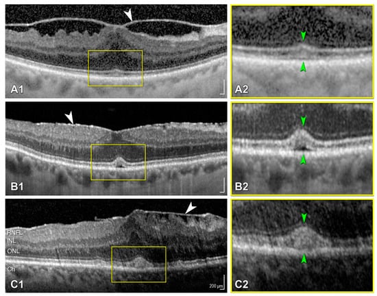 Tractional abnormalities of the central bouquet. Panels (A1–C1) and the corresponding magnifications (yellow boxes) (A2–C2) show SD-OCT scans through the fovea the different stages of central bouquet (CB) alterations, as proposed by Govetto et al. [7]. (A1,A2) Stage 1 CB alteration: a small, fuzzy hyperreflective area (cotton ball sign, green arrowheads), associated with a stage 3 epiretinal membrane (ERM) (white arrowhead). (B1,B2) Stage 2 CB alteration: a central hyporeflective pocket of subretinal fluid under the interdigitation zone (green arrowheads), associated with a stage 2 ERM (white arrowhead). (C1,C2) Stage 3 CB alteration: a thick, dome-shaped, hyperreflective, acquired vitelliform lesion between the retinal pigment epithelium and the ellipsoid zone (green arrowheads), associated with a stage 3 ERM (white arrowhead). Scaling is identical in all images. Scale bars are displayed in the bottom right corners of panels (A1–C1). For improved readability, units are only shown once in panel (C1). CB = central foveal bouquet; ERM = epiretinal membrane; RNFL = retinal nerve fiber layer; INL = inner nuclear layer; ONL = outer nuclear layer; Ch = choroid.