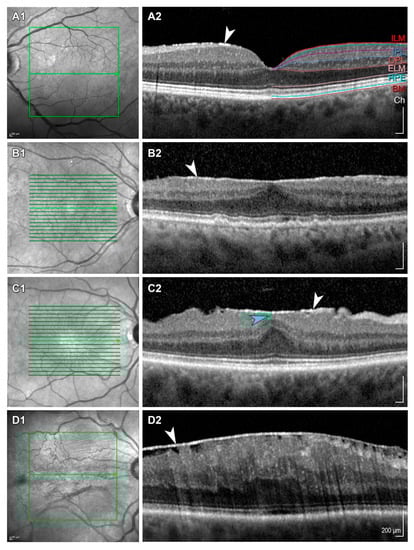 Staging scheme for epiretinal membranes. Panels (A1–D1) show near-infrared images, (A2–D2) display the corresponding OCT-B scans of ERM stages [4]. (A1,A2) Stage 1. Mild ERM (white arrowhead) with few anatomical changes. The foveal depression is preserved, and all retinal layers are well identified (selected layers labeled). (B1,B2) Stage 2. ERM with more advanced anatomical alterations. The foveal depression is lost, but all retinal layers are well defined. (C1,C2) Stage 3. The foveal floor is covered by continuous ectopic inner foveal layers (EIFL, teal arrowhead). As in Stage 2 ERMs, foveal depression is lost, but all retinal layers are well defined. (D1,D2) Stage 4. Advanced ERM with complete foveal disorganization. Thick EIFLs cover the foveal area, there is no foveal depression and all retinal layers are disrupted [30]. Scaling is identical in all images. Scale bars are displayed in the bottom right corner of panels (A2–D2). For improved readability, units are only shown once in panel (D2).