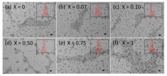 TEM images of Fe3−xCoxO4 nanoparticles with cobalt content of (a) x = 0, (b) x = 0.07, (c) x = 0.10, (d) x = 0.50, (e) x = 0.75, and (f) x = 1. The inset of each image shows the corresponding diameter histograms. Scale bar is 20 nm in all the images.