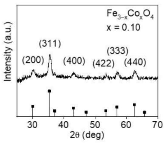 The crystalline phase of the Fe3−xCoxO4 (x = 0–1) nanoparticles was analyzed using XRD. In the XRD pattern of Fe3−xCoxO4 (x = 0.10) displayed in Figure 2, the XRD peaks are indexed to Fe3O4 confirming the formation of the single-phase material. The formation of the single-phase material confirms that the oleic acid and olylamine capping inhibits the oxidation of the nanoparticles.