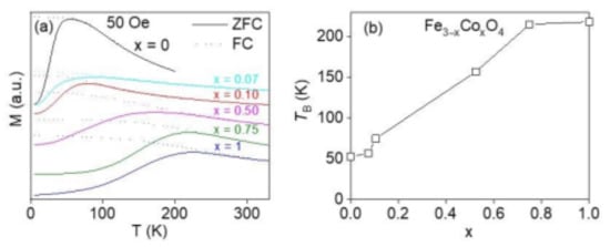 Zero-field-cooled (ZFC) and field-cooled (FC) magnetization vs. temperature in an applied field of 50 Oe for Fe3−xCoxO4 (x = 0–1) nanoparticles is shown in Figure 3a. Monodisperse, non-interacting, and superparamagnetic nanoparticles, which are ferromagnetic in the ground state, are known to show a maximum in the ZFC magnetization curve corresponding to the blocking temperature (TB) when the thermal energy is equivalent to the activation energy. The ZFC magnetization (MZFC(T)) curves for all the samples clearly showed maxima in the measured temperature range. It is evident that the MZFC(T) peak or the TB shifts to a higher temperature with an increase in the Co content. TB vs. Co content is plotted in Figure 3b and Table 2. The sharp increase in TB, with an increase in Co content until x = 0.75, can be attributed to the increase in the magnetocrystalline anisotropy of the nanocrystals []. The nearly constant value of TB from x = 0.75 to x = 1 indicates that the magnetocrystalline anisotropy of the nanocrystals does not increase with a further increase in Co content. This is in agreement with previous reports, where a decrease in magnetocrystalline anisotropy in Fe3−xCoxO4 (0.75 ≤ x ≤1) was reported [,,,,].