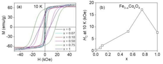 (a) M–H curve of 7 nm series of Fe3−xCoxO4 (x = 0–1) nanoparticles at 10 K. (b) Variation of coercivity (HC) at 10 K as a function of Co content.