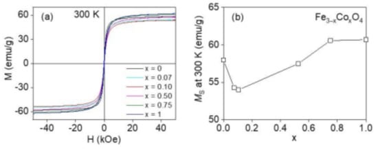 (a) M–H curve of 7 nm Fe3−xCoxO4 (x = 0–1) nanoparticles at 300 K. (b) Variation of saturation magnetization (MS) at 300 K as a function of Co content, x.