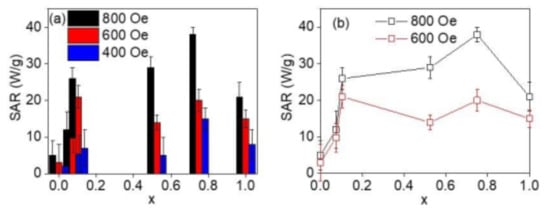 (a,b) Specific absorption rate (SAR) of 7 nm series of Fe3−xCoxO4 (x = 0–1) nanoparticles in water, measured at alternating current (AC) fields of 800, 600 and 400 Oe and 310 kHz.