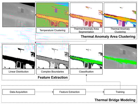 This study proposes a method for automatically detecting thermal bridges in building envelopes from thermal images. Figure 1 shows the method proposed in this study. First, the areas with thermal anomalies in the envelopes are clustered. Thermal anomaly area clustering involves three processes. The first process is clustering according to the temperature distribution, wherein areas with similar temperatures are considered as one cluster. Second, only clusters considered to be abnormal temperature distributions are segmented among the clusters with different temperature distributions. The results of classifying thermal anomaly areas are considered one cluster, even if the physical distance is distant, because clustering was performed by temperature distribution, as specified above. In the third process, clustering according to distance is performed, to recognize physically separated areas as different defects. The results of thermal anomaly area clustering allow us to obtain physically separated clusters with an abnormal temperature distribution. Features to detect thermal bridges are extracted from these individual clusters. Because thermal bridges have long vertical or horizontal shapes, this study selected linear distribution and complex boundaries as the features. After extracting the features, a pre-trained thermal bridge detection model is used to recognize areas corresponding to thermal bridges within the thermal image.