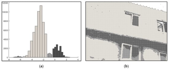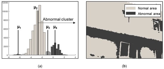 As mentioned above, GMM-based clustering allows us to obtain the temperature of the pixels included in each cluster. The average temperature in each cluster is calculated by using the temperature of the pixels in each cluster. After calculating the average temperature of each cluster, the number of pixels in each cluster is counted. The cluster with the most pixels is regarded as the area corresponding to the normal outer wall. As shown in Figure 3a, the clusters are distinguished with an abnormal temperature distribution by reflecting the season based on the average temperature µ2 of the cluster with the most pixels. For example, during winter, the normal outer wall shows a relatively lower temperature than areas with thermal anomalies, such as thermal bridges. Therefore, in the case of thermal images measured in winter, clusters with an average temperature higher than the average temperature of the cluster with the most pixels are classified as abnormal areas. In terms of thermal images measured in summer, clusters with an average temperature lower than the average temperature of the cluster with the most pixels are classified as abnormal areas. Since the example in Figure 3 was measured in winter, clusters with average temperatures (µ3 and µ4) higher than µ2, the average temperature of the cluster with the most pixels, are classified as abnormal clusters. Figure 3b shows an example of abnormal temperature areas segmentation.