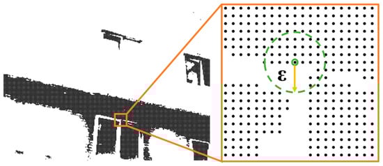 The segmentation process of abnormal area pixels by applying DBSCAN is as follows. First, the pixels in the abnormal areas are converted into 2D coordinate values. The pixels converted into 2D coordinate values have x and y coordinates, respectively. After selecting a random starting point among the points converted into 2D coordinates, the neighboring points located within a certain distance (ε) are identified from this starting point. If the number of points within ε is equal to or greater than the minimum number of points (MinPts), the corresponding point and neighboring point are considered as one cluster. Then, the process is repeated for all the neighbors. If the number of neighboring points is less than MinPts, the corresponding point is considered as noise. After repeating this for all the neighbors, the procedure above is repeated for all the remaining points. Figure 4 below shows the clustering process of pixels segmented as abnormal areas by applying DBSCAN.