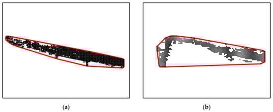 A convex polygon that contains the points constituting each cluster can be obtained by calculating the convex hull. Based on the convex polygons, the area occupied by the convex polygons constituting each cluster is calculated. Among the areas occupied by the convex polygons, the proportion of the actual points depends on the distribution of the points in the cluster. As shown in Figure 5a, in the case of thermal bridges, the actual points account for a large proportion of the area of the convex polygon. However, in the case of clusters that are not thermal bridges, the actual points account for only a small proportion of this area, as shown in Figure 5b. Since each pixel has an area of 1 by 1, this study calculated feature , which determines the complexity of data boundaries, as the number of pixels relative to the area enclosed by a convex hull. The second feature is calculated as follows: