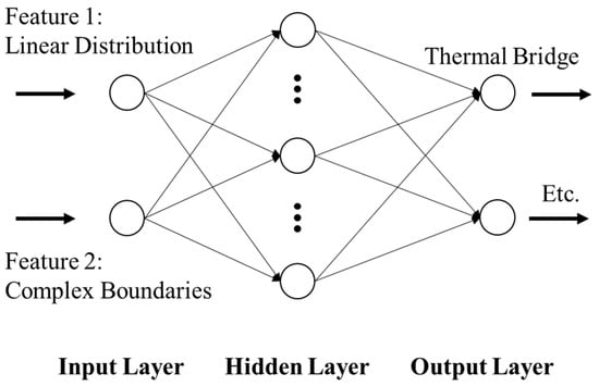 In the case of thermal images including thermal bridges, images of actual thermal bridges must be obtained because there is no large-scale public database. Therefore, this study constructed a structure for learning small datasets because of the lack of training datasets for thermal-bridge modeling. The training process was performed by extracting features from images of previously collected thermal bridges and other thermal-anomaly areas. This study applied a backpropagation neural network, which is appropriate for processing small amounts of data to train the ANN [31]. Among the training parameters, the number of hidden layers has a significant influence on prediction results [32]. This study set the number of hidden layers to one by considering the number of input and output layers. The sigmoid function was applied as the activate function of the hidden layer. Figure 6 shows the structure of the ANN in this study. The datasets for training were randomly divided into training at 70%, validation at 15%, and testing at 15%, which is a good ratio for small datasets [33].