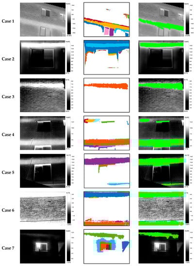 Figure 7 shows the thermal images, segmentation results, and thermal bridge detection results used for validation. The segmentation results are the results of performing GMM-based clustering, thermal anomaly area detection, and DBSCAN-based clustering. In Figure 7, each cluster is displayed in different colors, and the pixels of the same color are in the same cluster. When the thermal images only displayed a wall, as in Cases 3, 6, and 8, the areas corresponding to thermal bridges were segmented well. However, as shown in Cases 1, 2, 4, 5, and 7, if a thermal image contains areas that appear to be thermal defects due to low thermal performance, such as windows and walls, the image contains clusters that are both thermal bridges and not thermal bridges.