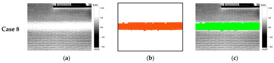 When there are clusters that are thermal bridges and not thermal bridges, clusters corresponding to thermal bridges can be classified by performing machine-learning-based classification after feature extraction. Figure 7c shows the thermal bridge detection results for each case. In the detection results, the areas highlighted in green represent the thermal bridge areas detected by the proposed method. As shown in the results, when there is only one thermal bridge, as in Case 1, Case 2, Case 3, Case7, and Case 8, only one cluster was detected as a thermal bridge in the detection results. In Case 6, where there are two thermal bridges, two clusters were detected as thermal bridges. However, in Case 4 and Case 5, the areas where heat was generated because of the window frame and heating pipe were classified as thermal bridges, but they actually were not thermal bridges. This was because these areas had similar shapes as thermal bridges. The results below show that the thermal bridge detection method proposed in this study can automatically detect multiple thermal bridges, even when thermal images contain patterns that appear to be thermal defects other than thermal bridges.