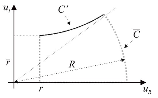 where is the dotted gray closed contour defined in Figure 2, (the black solid line in Figure 2) is the integration path defined by the Equations in (20) and (21) along with the function does not oscillate, and denotes the intersection point between the path and the straight line .